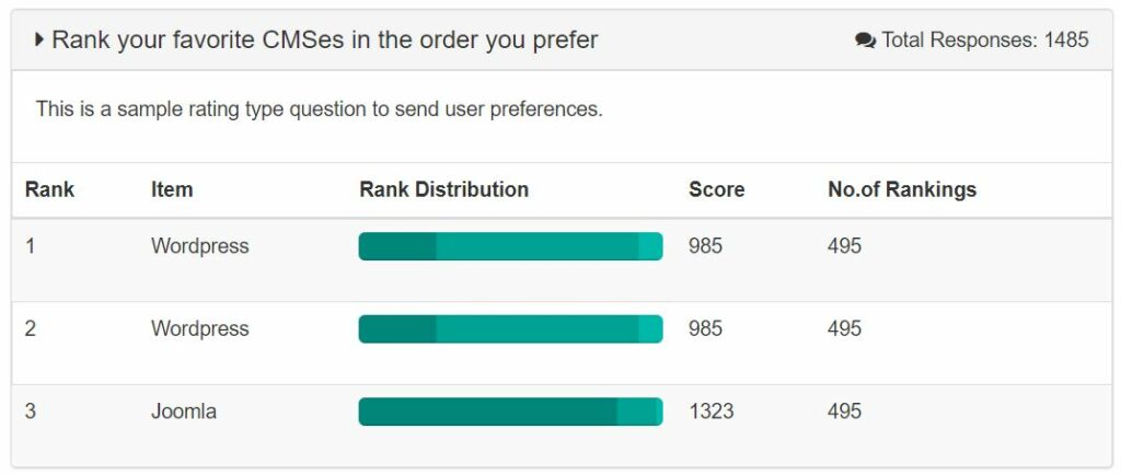 Ranking questions allow users to compare the answers by drag-and-drop and placing them in order of their preference. In Community Surveys, you can give weightage to each answer apart from the ordering weightage chosen by the user. While displaying the consolidated report, the order of the answers chosen by the user and their weightages are considered in showing the charts.