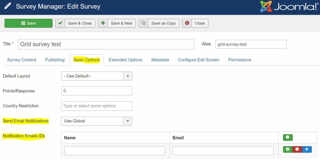 You can send email notifications to the users in a user group. Go to Extensions -> Plugins and search for the “Community Surveys – Surveys” plugin and edit the plugin. Go to the Emails tab of the plugin options. Here you can select the user group to send notifications for new responses as well as new surveys.